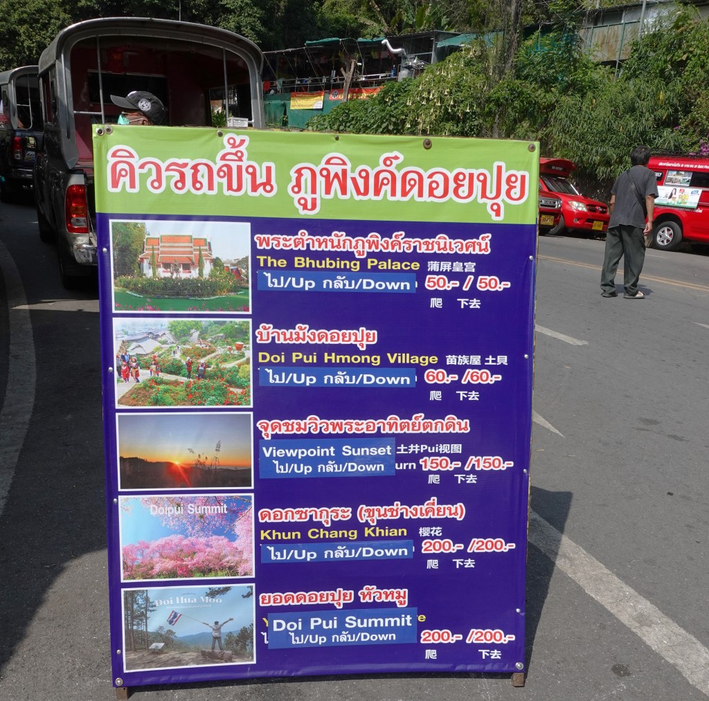 ドイステープ寺院の階段登り口でロッデーンを降りると、さらにその先の景勝地までの料金の案内板が目に飛び込んできた。それらの場所までは学生時代はまだ未舗装で、徒歩やレンタルバイクで行っていたところである。いつかまたロッデーンに乗り行ってみよう。