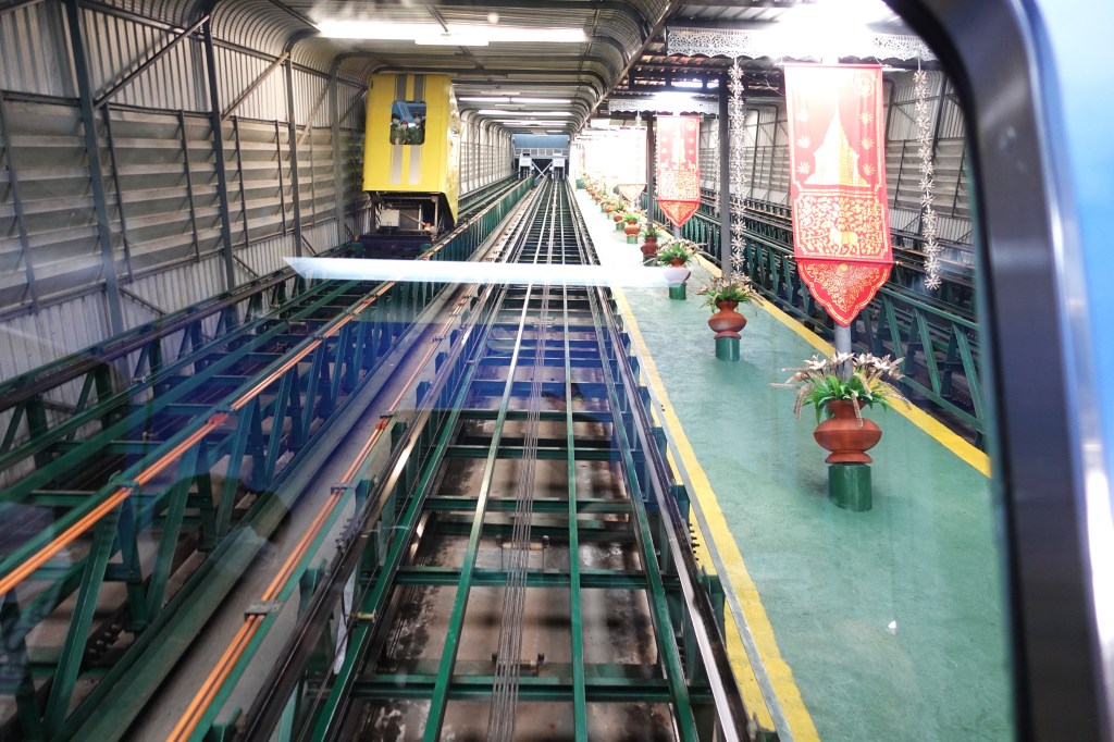 ケーブルカーは1両で少し大きめのエレベーター型をしている。車内から見るとこんな感じ。下りとすれ違う