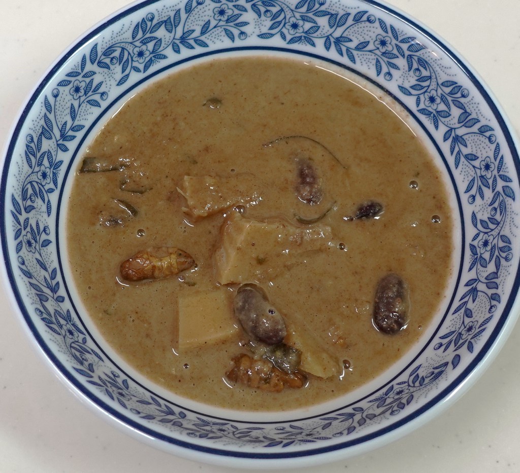 【グリーンカレー】ピリ辛で、どろっとした濃厚なカイコのグリーンカレー。カイコ蛹は新鮮。レッドキドニー(赤いんげん豆)が印象的。グリーンカレーに定番のタケノコ入り。もっとコブミカン葉の風味が欲しかった。
