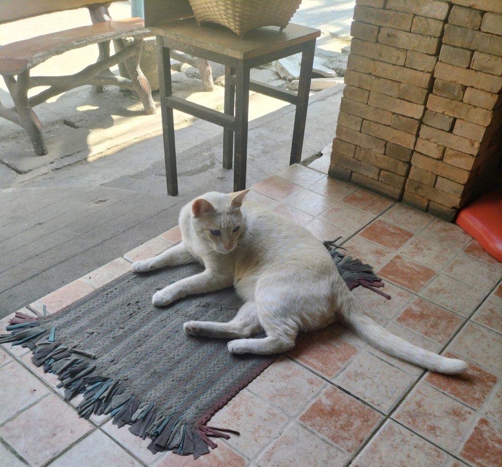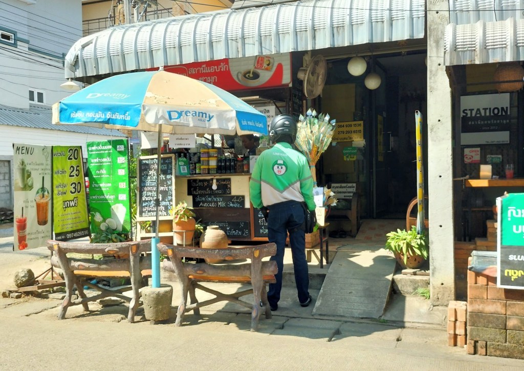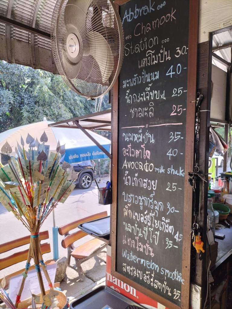 フアンムアンチャイの門をくぐると、つるしたサトウキビにタイヒメカブトがいるのを発見、しかもよく見ると注文予定の魚のラープ「ลาบปลา」の旗を持っていた 😲