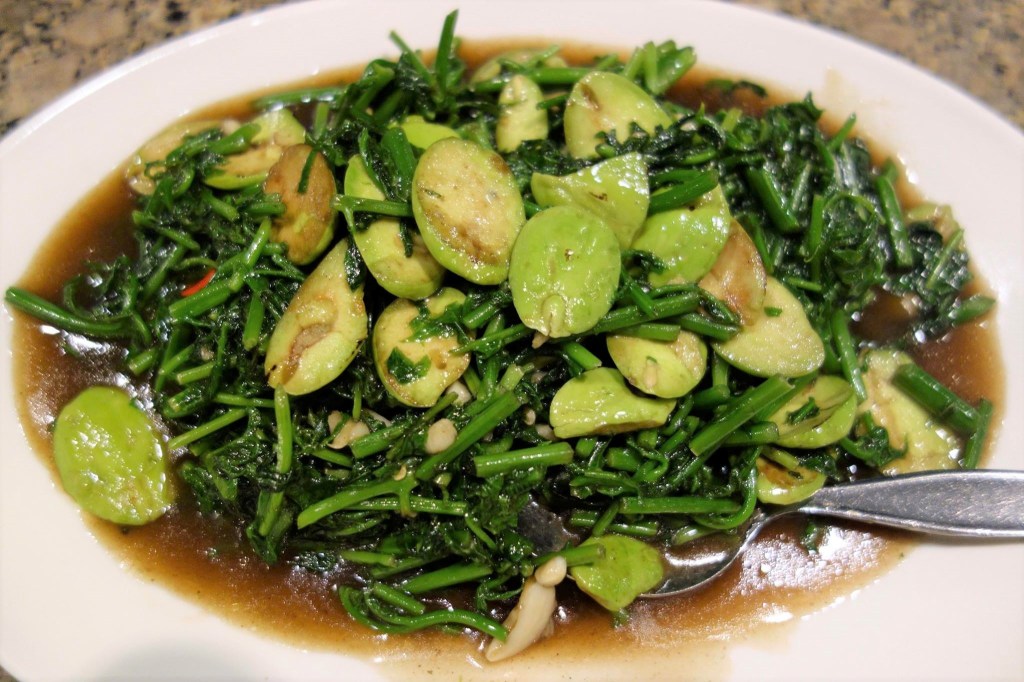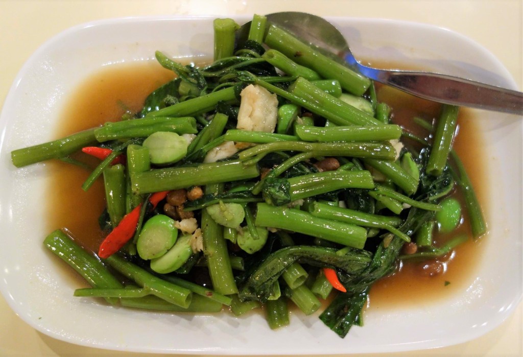 コンドの近くの食堂 Khao Tom Baht Diao で食べた「エノキタケのヤム」60B 見た目よりずっと辛く、新しく皿をもらい、それに上げて食べた
