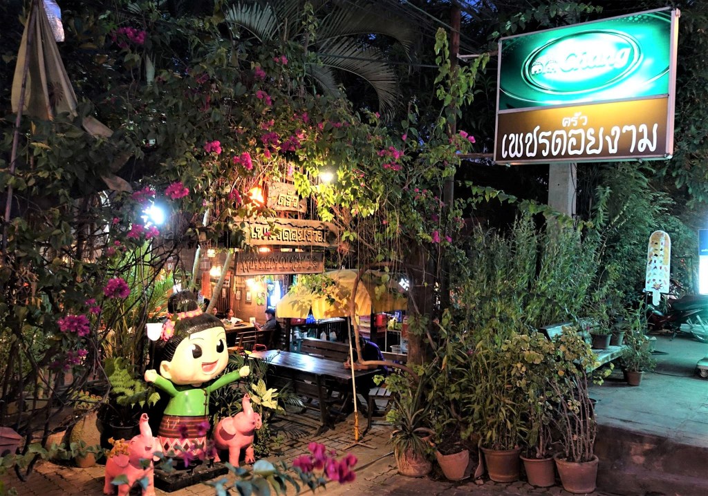 北タイ料理店「Seen Nimman」(Krua Kon Muang) 風が通り植物いっぱいの自然の中で食べるって感じ。最近、雨が降っても大丈夫なように部分的に透明のシートの屋根ができた。可愛いネコが3匹いる。