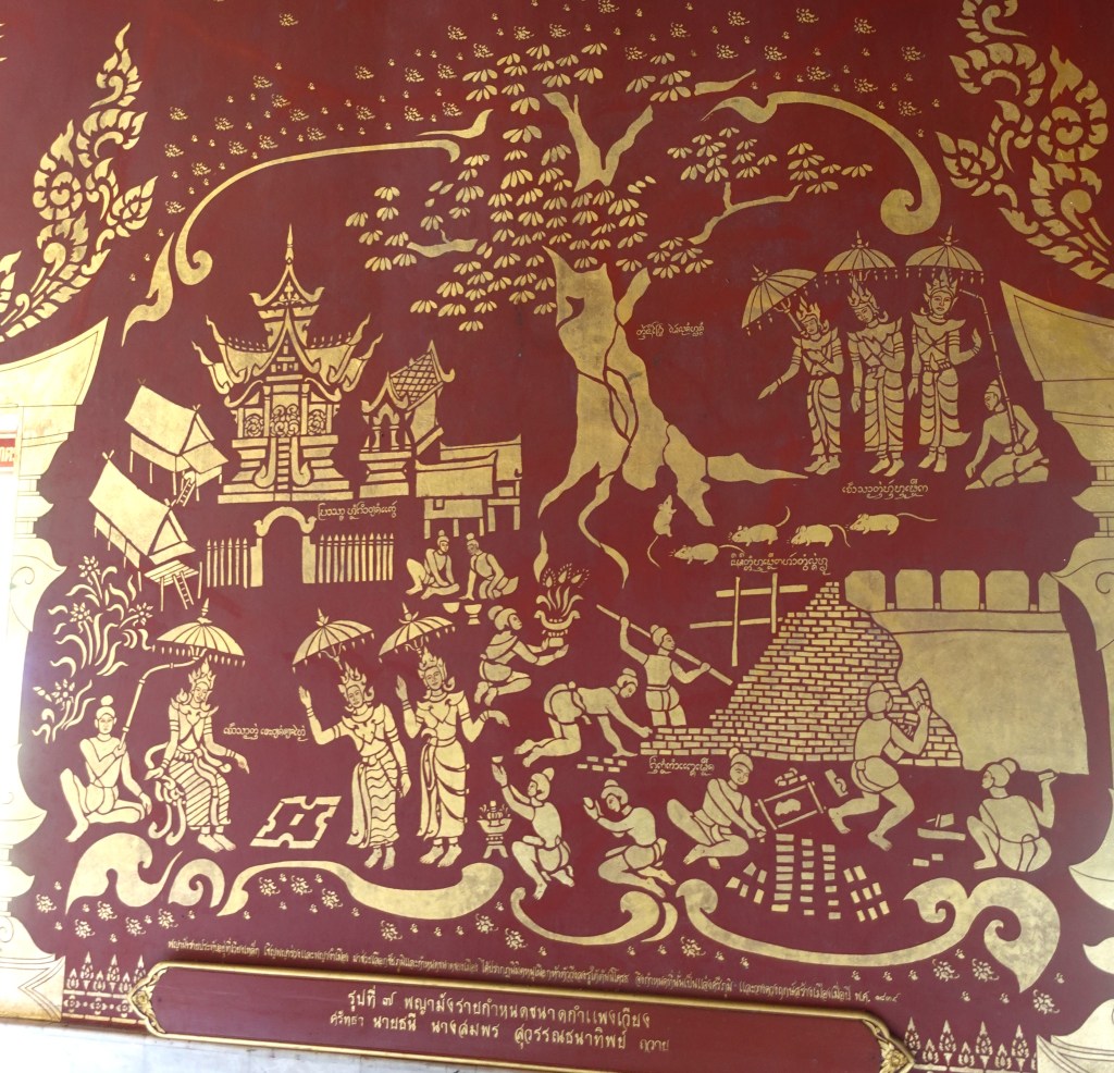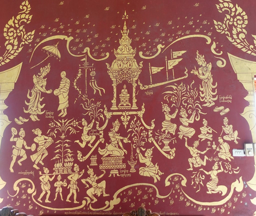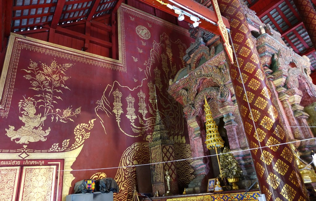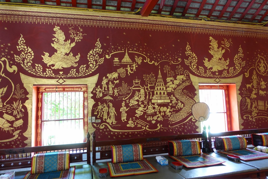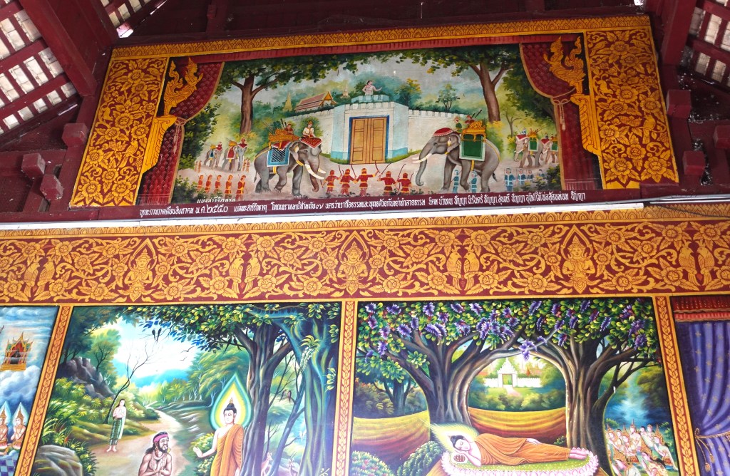 大本堂壁面には赤地に黄金で描かれたストーリー性のある圧巻の壁画 初代王メンラーイによるワットチェンマンの建設の歴史が描かれている