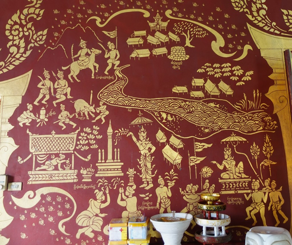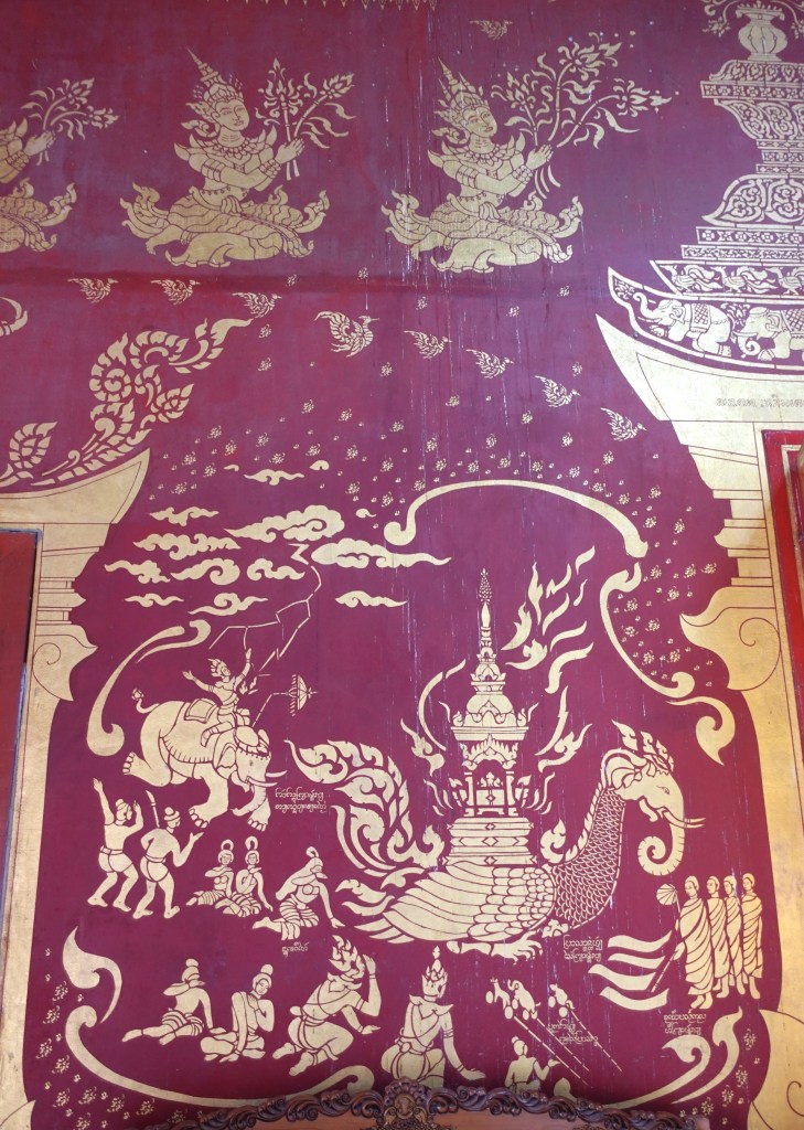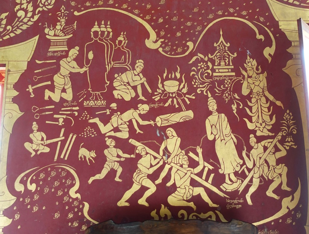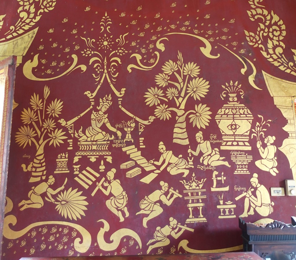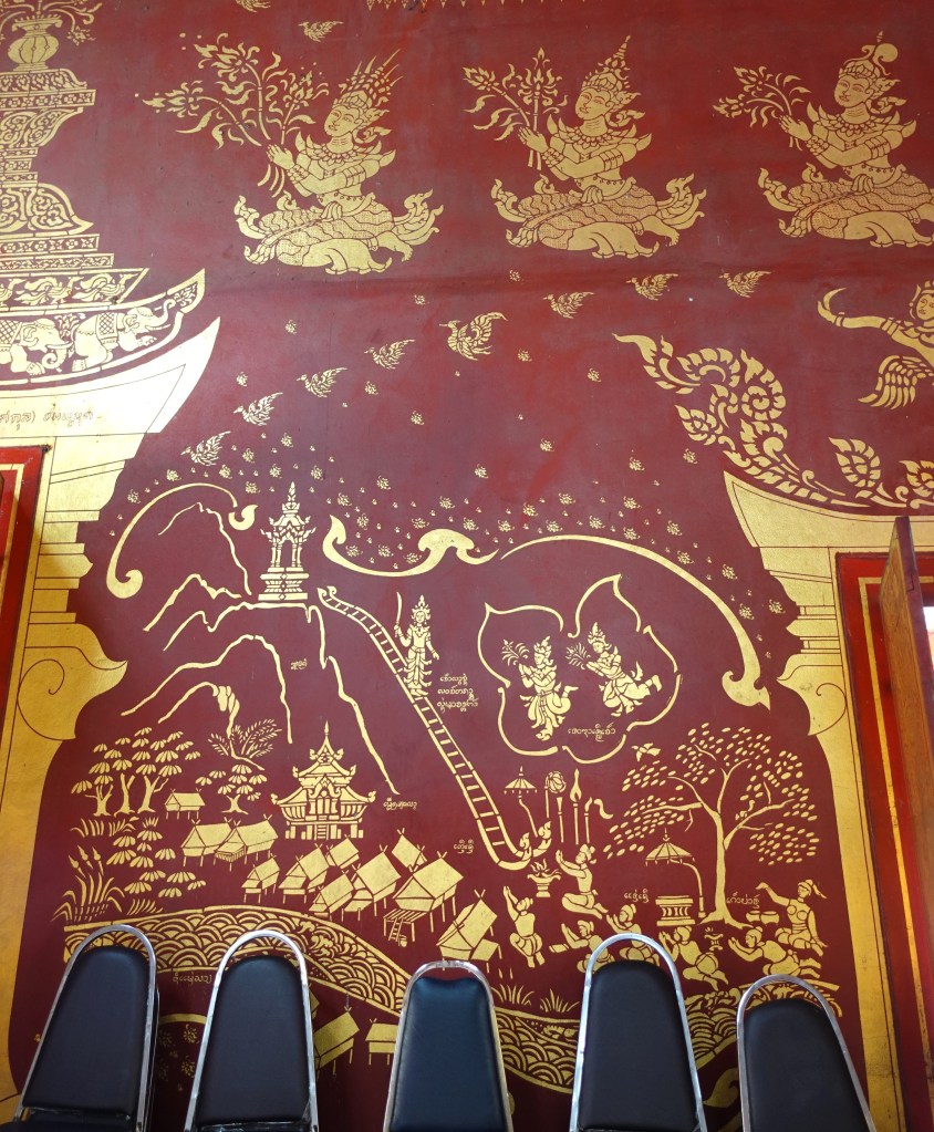 大本堂壁面には赤地に黄金で描かれたストーリー性のある圧巻の壁画 初代王メンラーイによるワットチェンマンの建設の歴史が描かれている