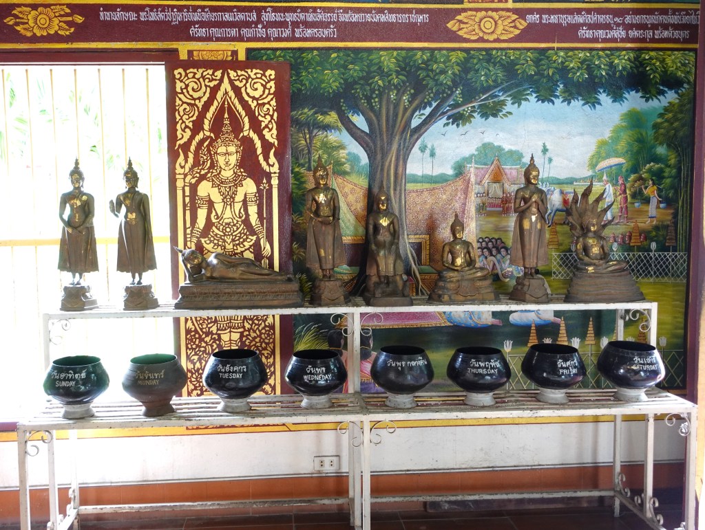 8体の「守護仏」自分の誕生日(曜日)の守護仏、向かって左から日曜日の守護仏で、水曜日だけは「昼」と「夜」の2体、最後の右端は土曜日の守護仏