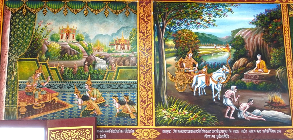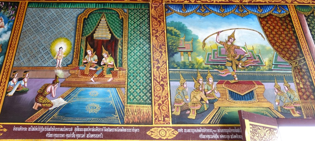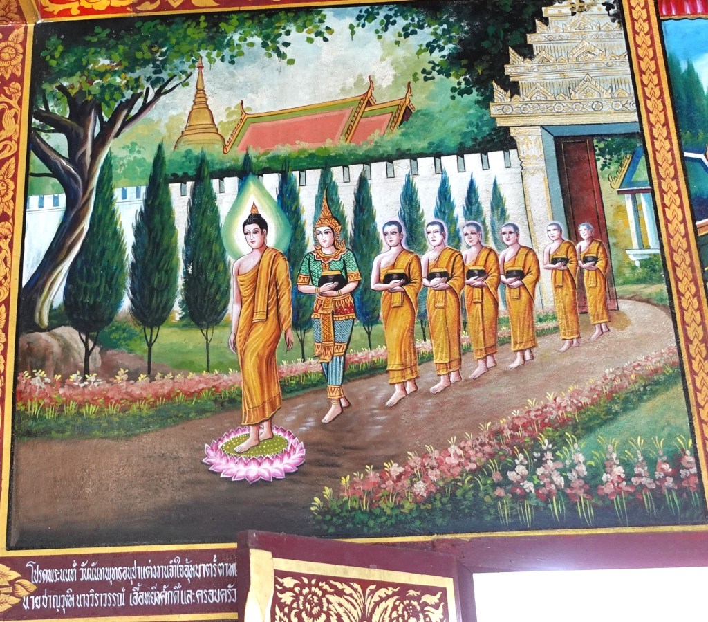 小本堂の入口の左上の壁に描かれている「プラセータンカマニー」 (Phra Sae Tang Khamani, พระเสตังคมณี)