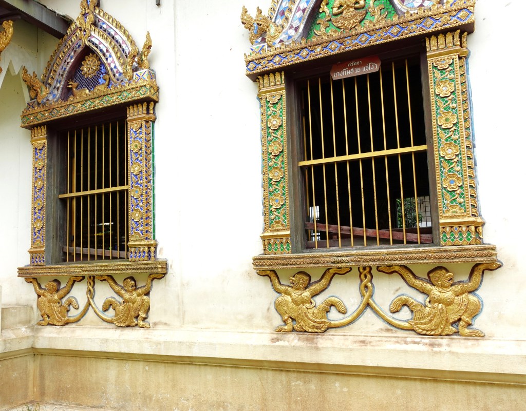 小本堂の窓を外から見ると、インド叙事詩ラーマーヤナ悪魔守護者によって護られている