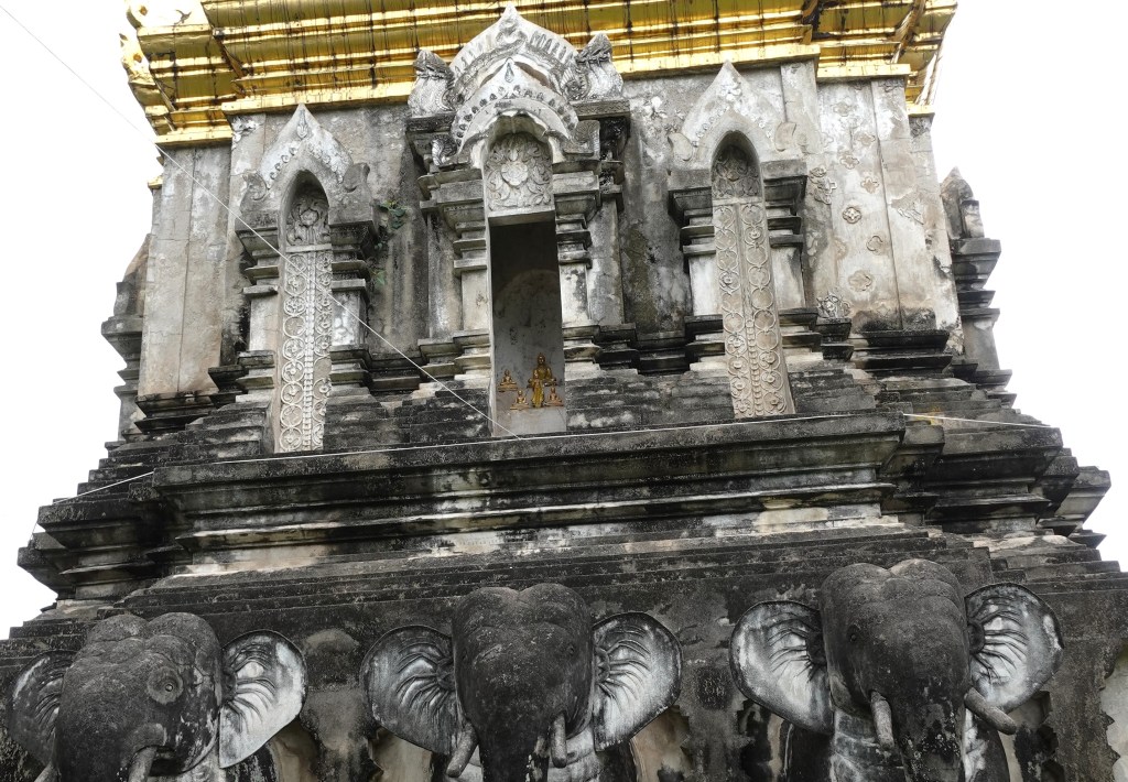 象の耳が不思議、象は体温を下げるとき耳をパタパタさせて、耳の裏の血管から熱を発散させている。しかしこの仏塔の象はこっちを向いているが、血管が大きく浮き出た耳の裏側もこっち向きである