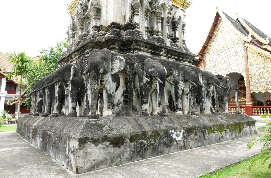 仏塔の周りを15頭の迫力のある実物大の象で囲まれている