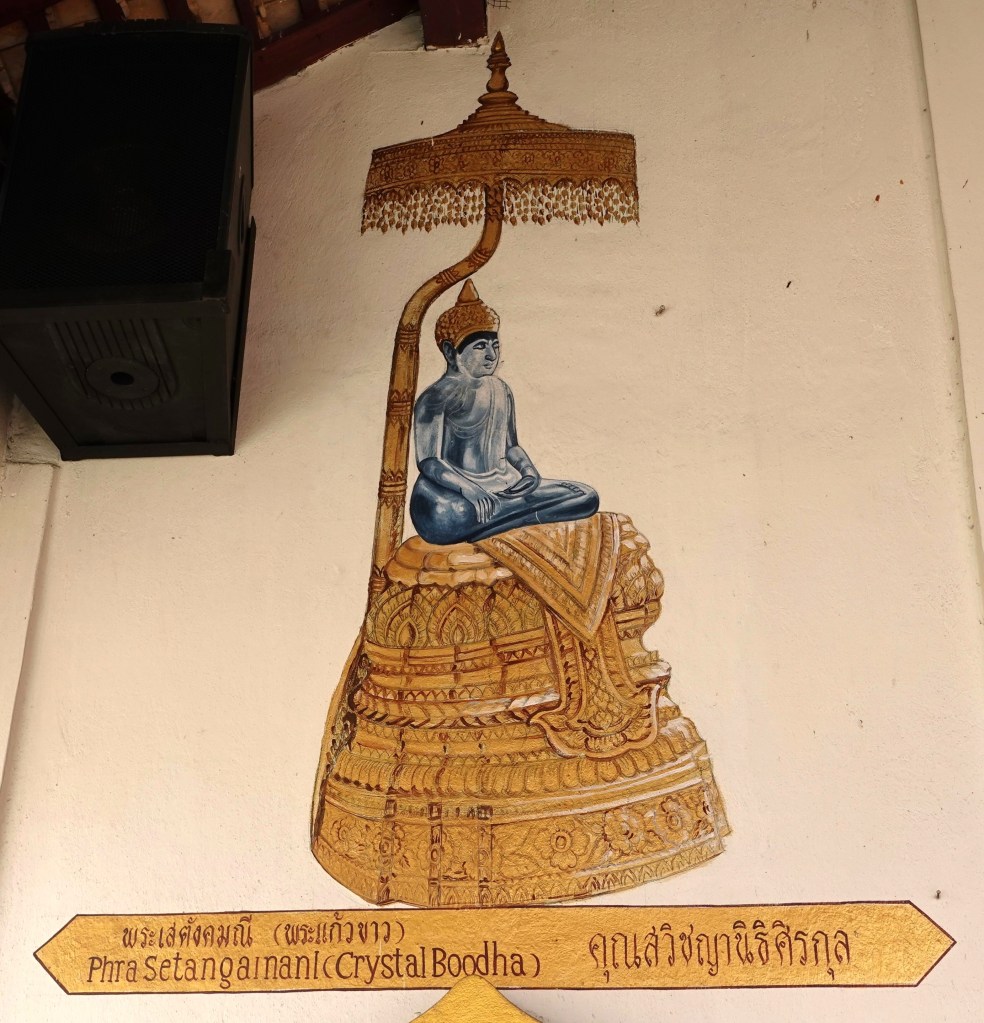 この坐像は「プラケーオカーオ」(Phra Kaew Khao, พระแก้วขาว) や「水晶の仏像」(Crystal Buddha) ともいわれている。高さは10cm程で透明な石英の結晶を彫ってつくられている。この仏像は西暦200年ごろロッブリーの王のためにつくられ、662年に女王チャーマテーウィによりハリプンチャイ王国(現在のランプーン)に持ち込まれたといわれている。これはマンラーイ王がランプーンを征服した後、1296年になってチェンマイに移された