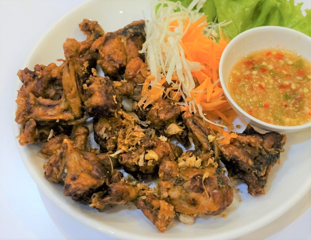 カエルを骨までミンチにして炒めてあるので、骨の破片がいっぱい。カルシウム抜群。ガパオの風味が強く、しかも辛い。嗚呼イサーンだ。
