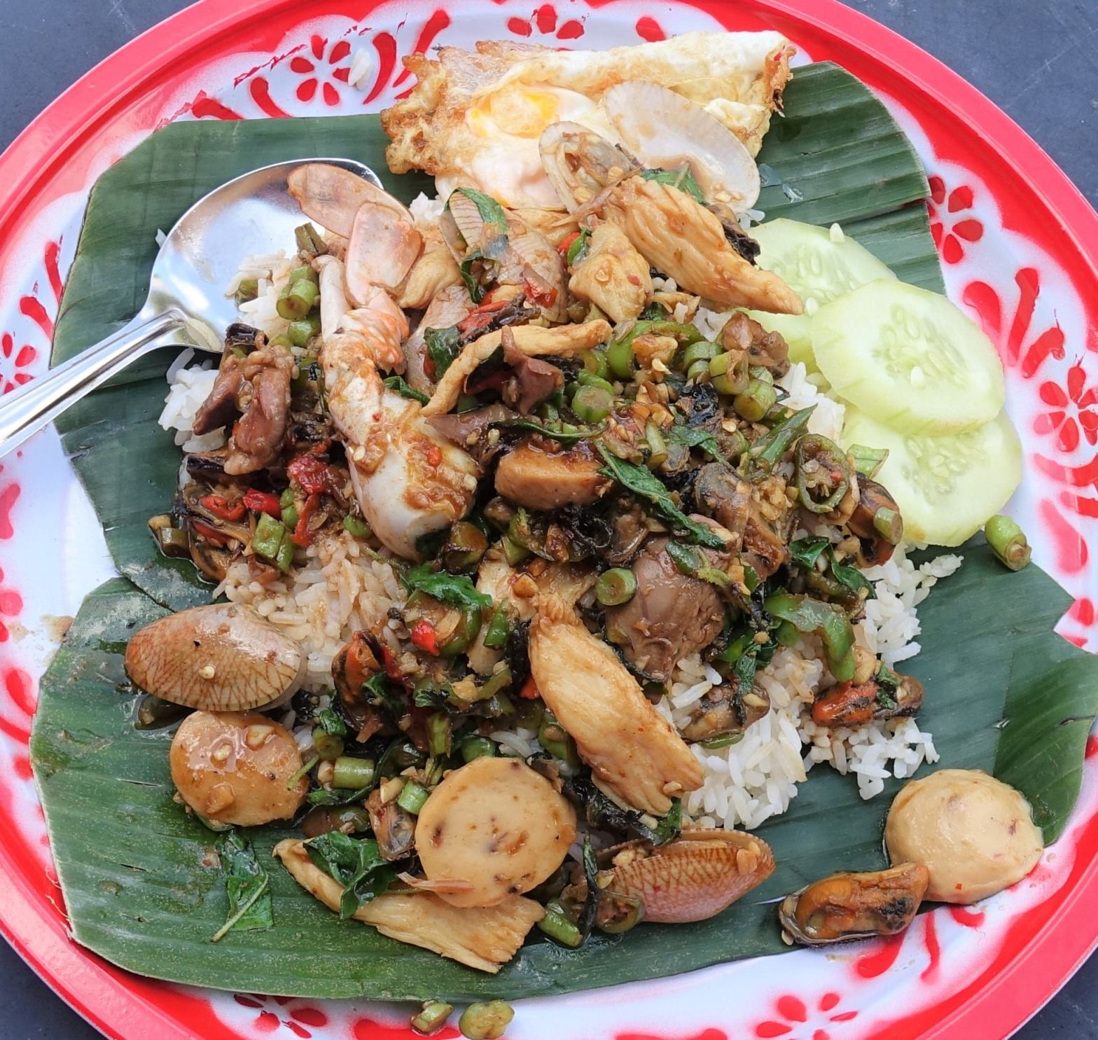 チェンマイの食堂でガパオを注文すると豚肉であるが、南部ではカニ足や貝や魚肉つみれ、鶏肉をガパオと一緒に炒める。目玉焼きをのせるところは同じ。