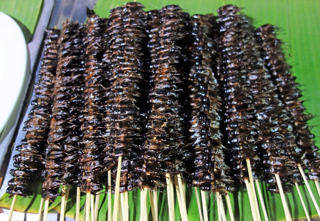 タイ東北部のメコン川沿いにある小さな街チェンカーンの夜市で「虫の串焼き」を食べた。