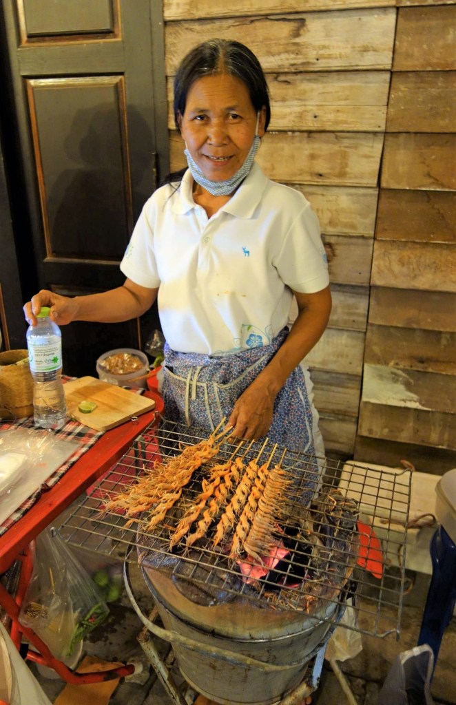 種類的にはカイコの蛹とコオロギの2種類だったが、なんと1本の串に30匹以上刺さっている。圧巻である。食べたい串をおばちゃんに渡すと炙り直してくれる。1本20バーツ。