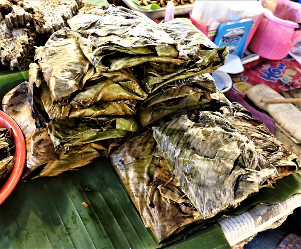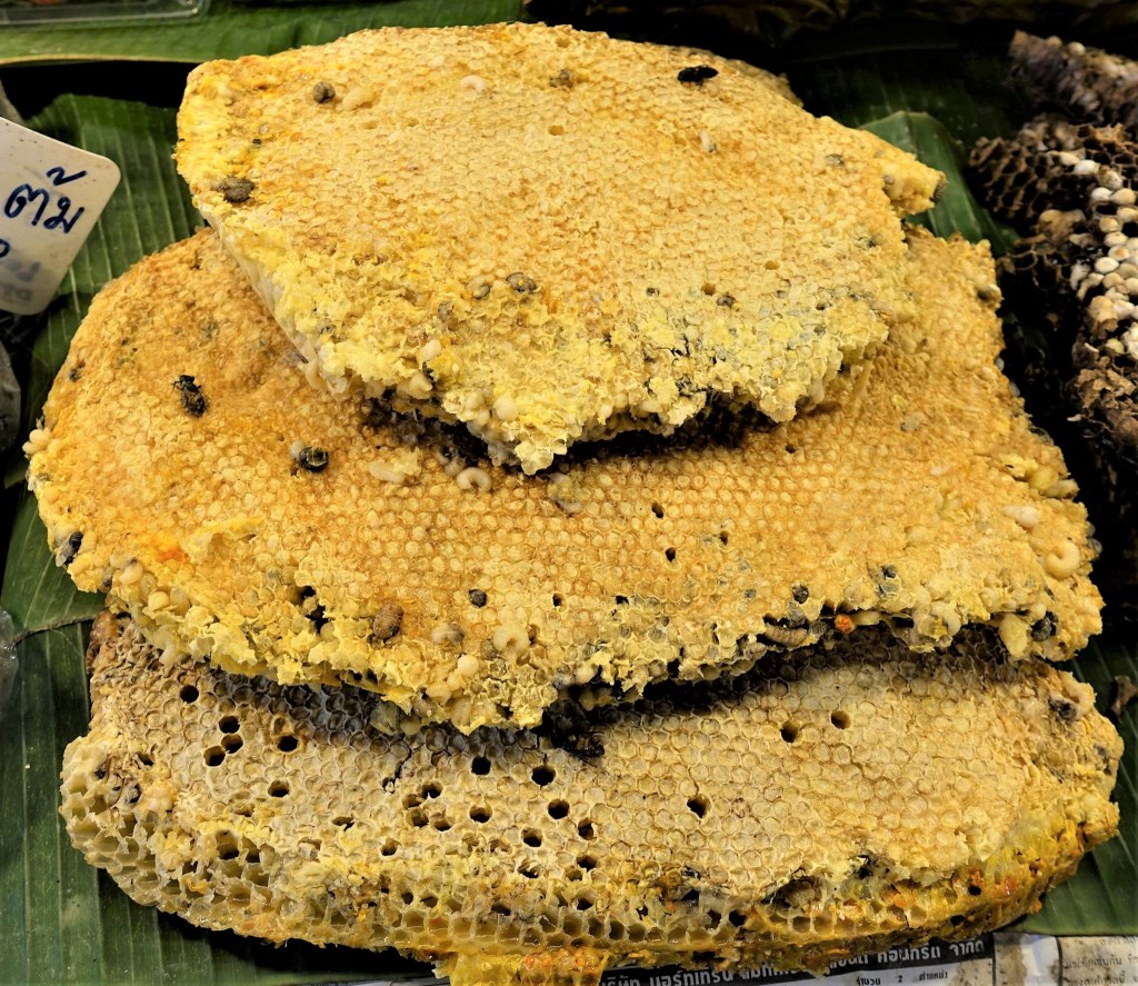 ミツバチの巣をバナナの葉に包みかるく炙ったものを、生のミツバチの巣と共に売っていた