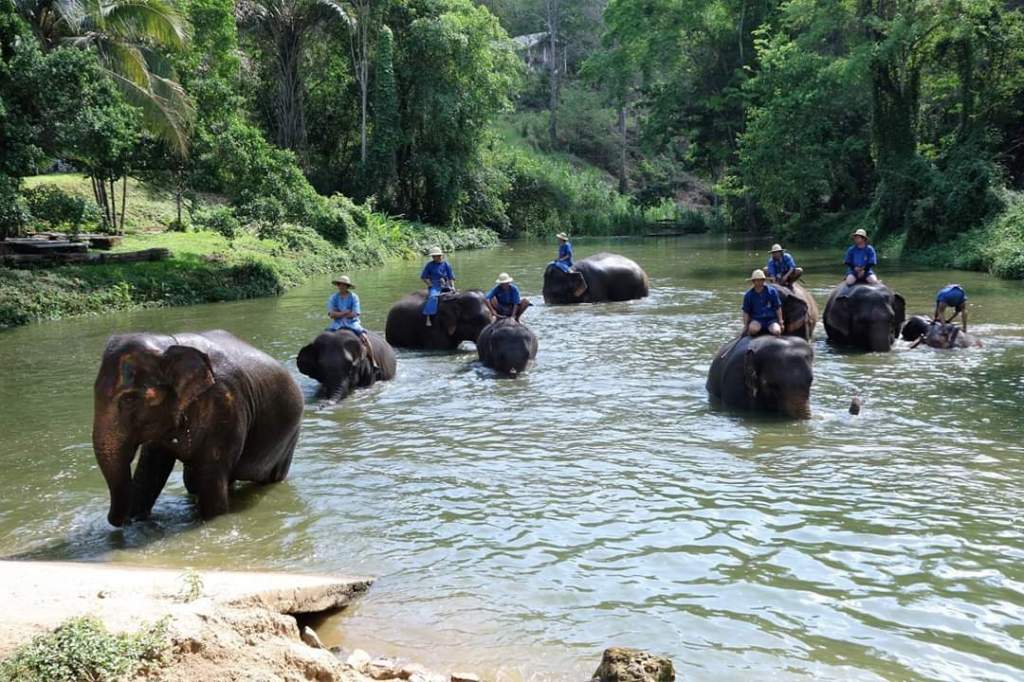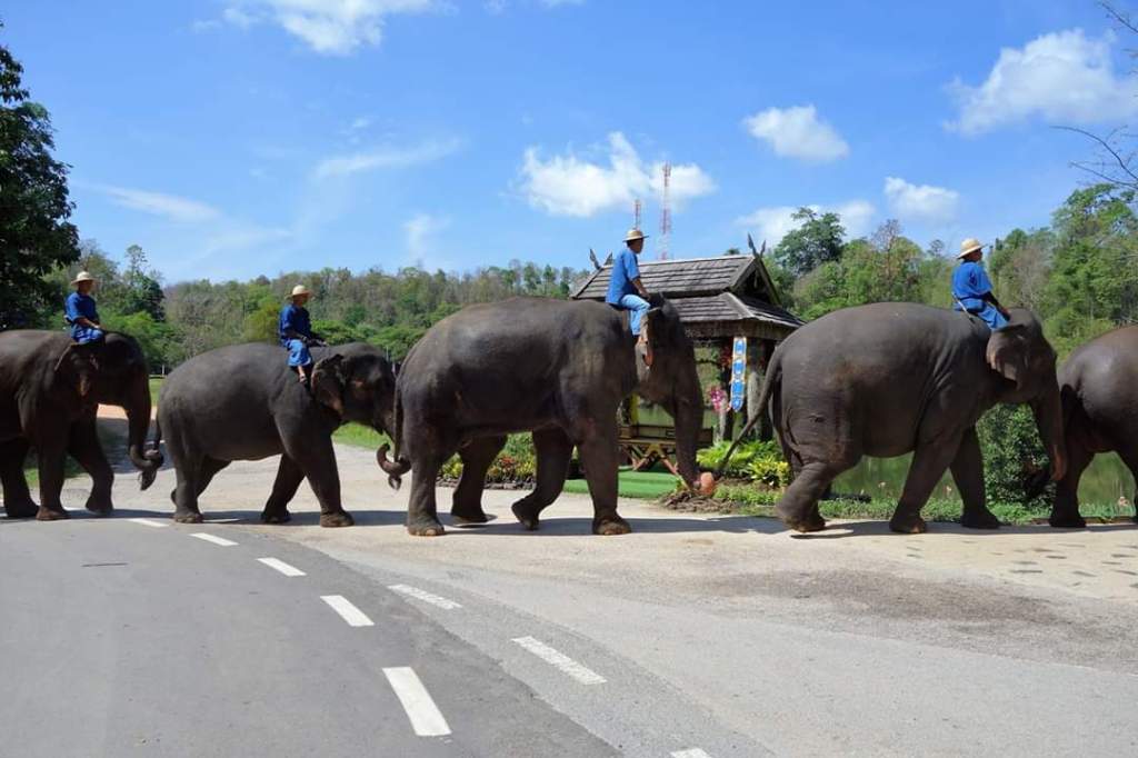 国道を横断するときは、前のゾウの尻尾を鼻でつかんで一列になる