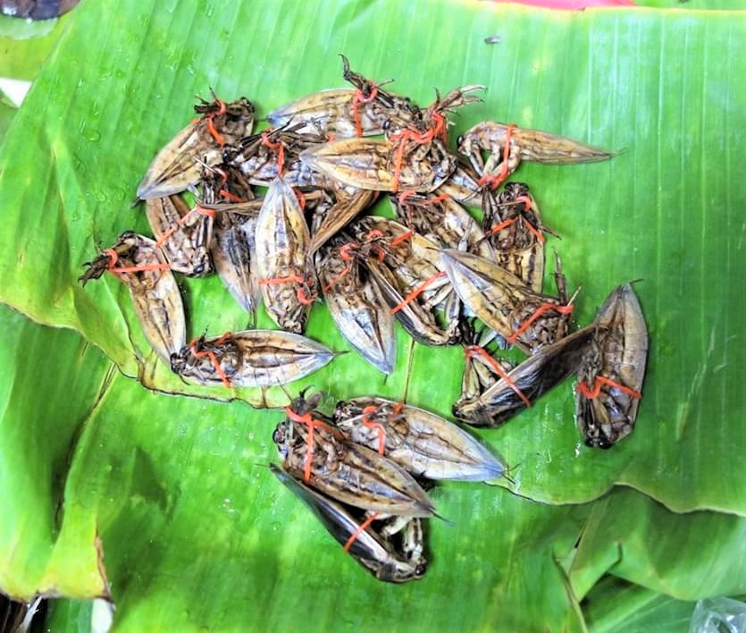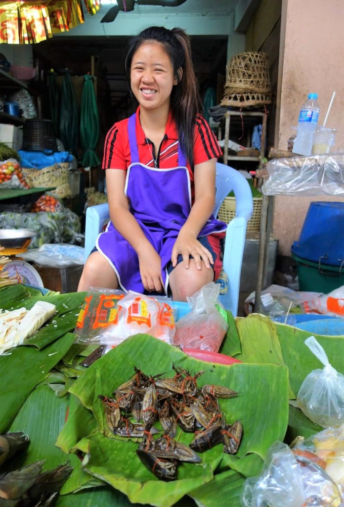 ランパーンの市場で出会ったタガメ売りの少女は、タガメの足を輪ゴムで束ねて売っていた。