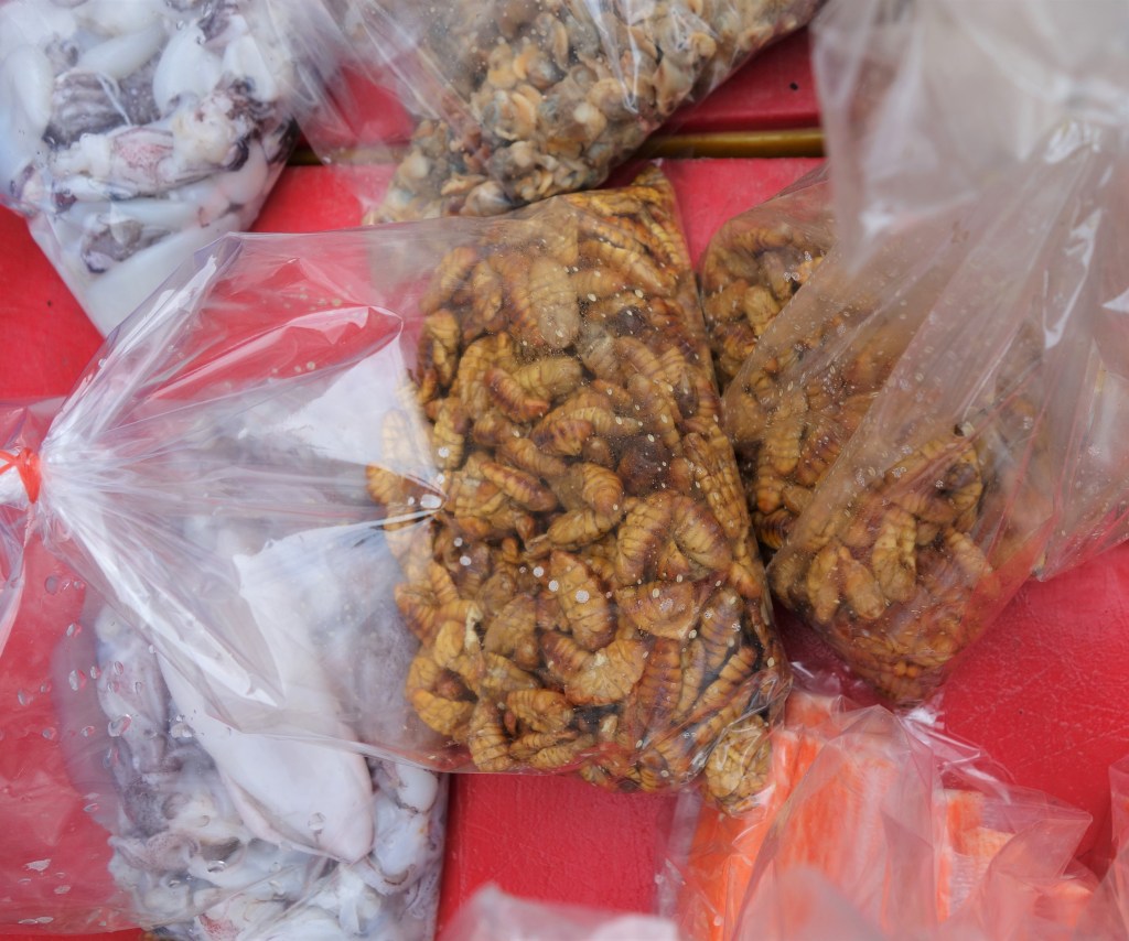 ミツバチの巣やイエコオロギ、フタホシコオロギ、カイコの蛹を売っていた。