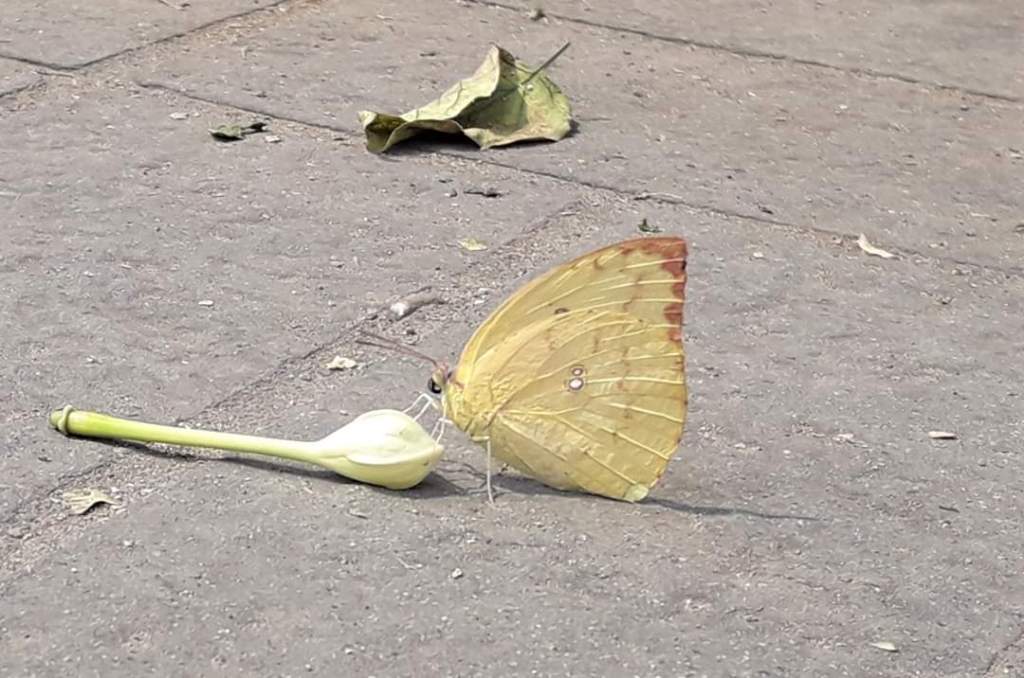 落ちたつぼみに蝶が舞い降りてきた