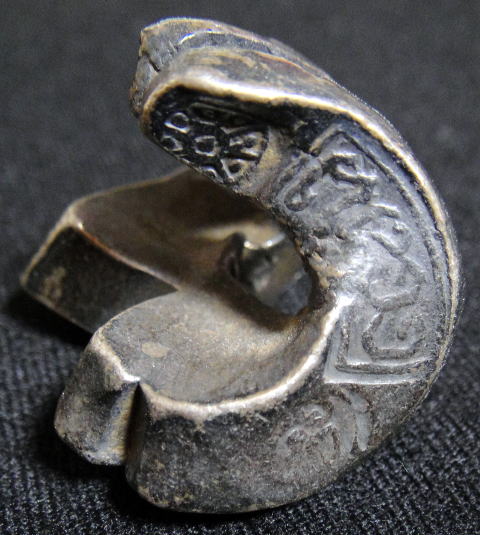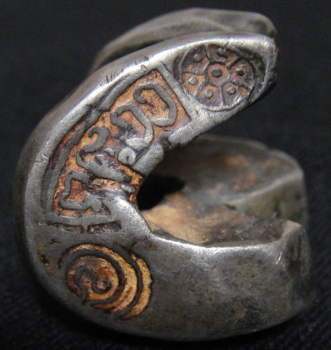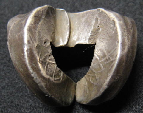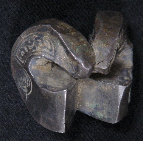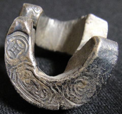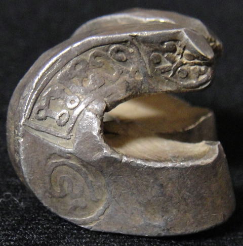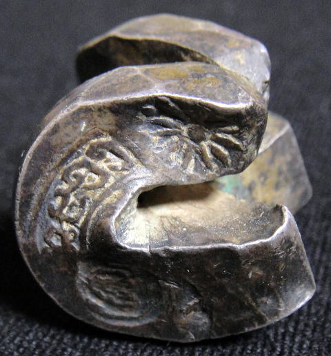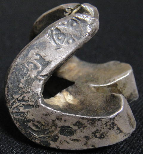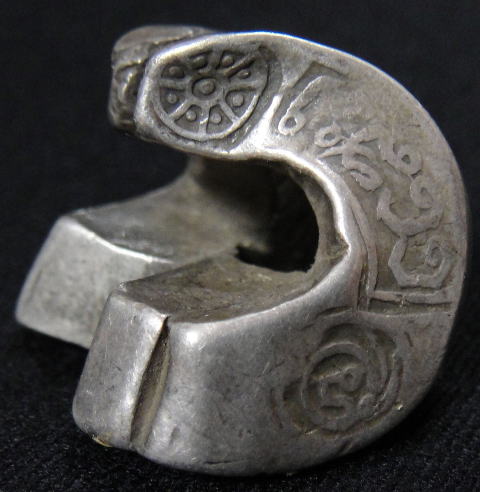 チェン(Chieng)貨幣 Mitchiner(1998)の分類 Stage four 62.02 g 銀 1290~1556年 両アームの3つの刻印は前から,「太陽」「Sen(Chiengsen)」「4(ランナー文字)」 「4」は,1 tamlung(4 ticals)=4バーツ Chiengmai,Chiengsen,Chiengrai,Fang,Han,Sak,Lakhon,Prae,Saw,Nan などの地方によって刻印が異なる。 この貨幣は,チェンセーン地方で発行されたものである。 チェンセーンはメコン川沿いの小さな街で,対岸は現在のラオス