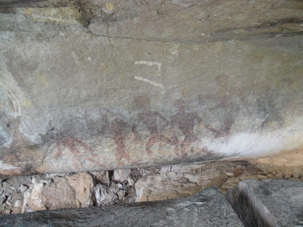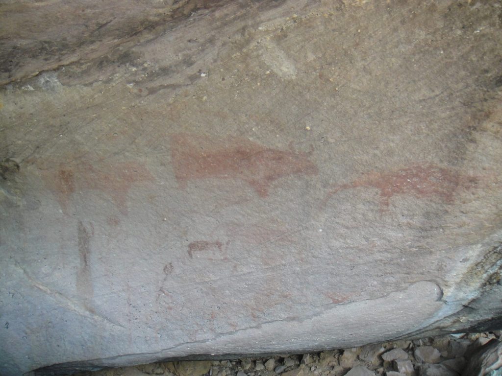 岩肌に赤い塗料で描かれた人や牛などの壁画があり、狩りのようすなど先史時代の人々の営みを窺い知ることができる