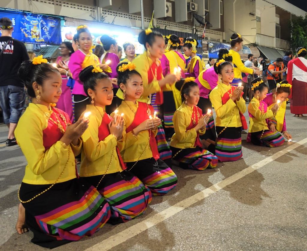 3人の王様像広場前でロウソク踊りを舞うチェンマイの女性たち