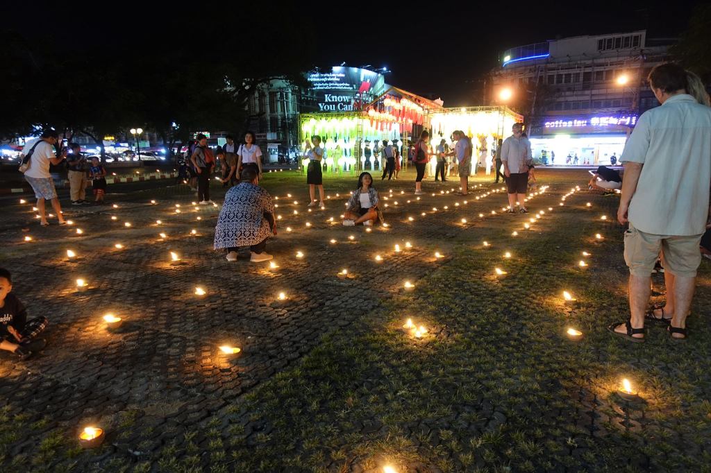 「ローイクラトン祭り」初日は、3人の王様像広場前でチェンマイの女性900人による「ロウソク踊り」が披露された。手首を回すときロウソクの火が消えた人も、1本消えたら他方の火を移すけど、そのとき失敗すると2本とも消えてしまう、マイペンライ。それにしても圧巻だった。