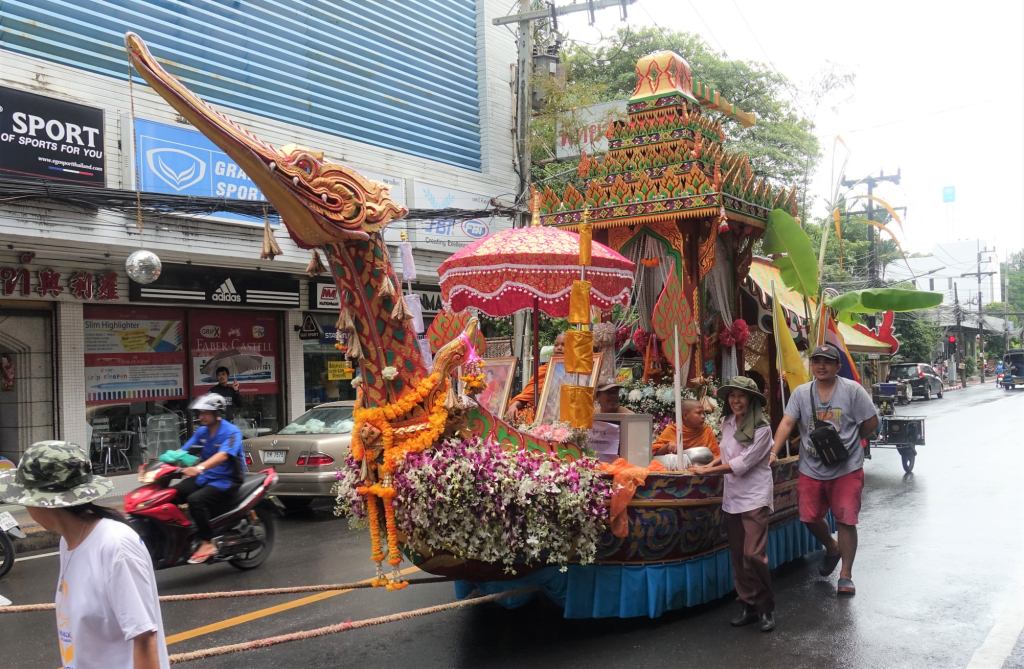山車を寺院まで代わるがわる引いて行くが、自分の家や商店近くに差し掛かるとお札をタンブンし、綱を形だけ引っ張る、というものである。車の窓からタンブンする市民もいた。