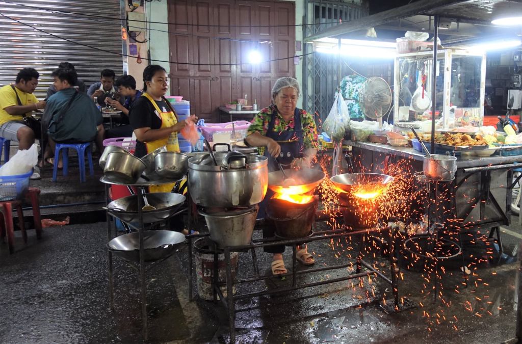 タイ南部ナコーンシータマラートで見た火花を散らしながらの空芯菜炒め作り