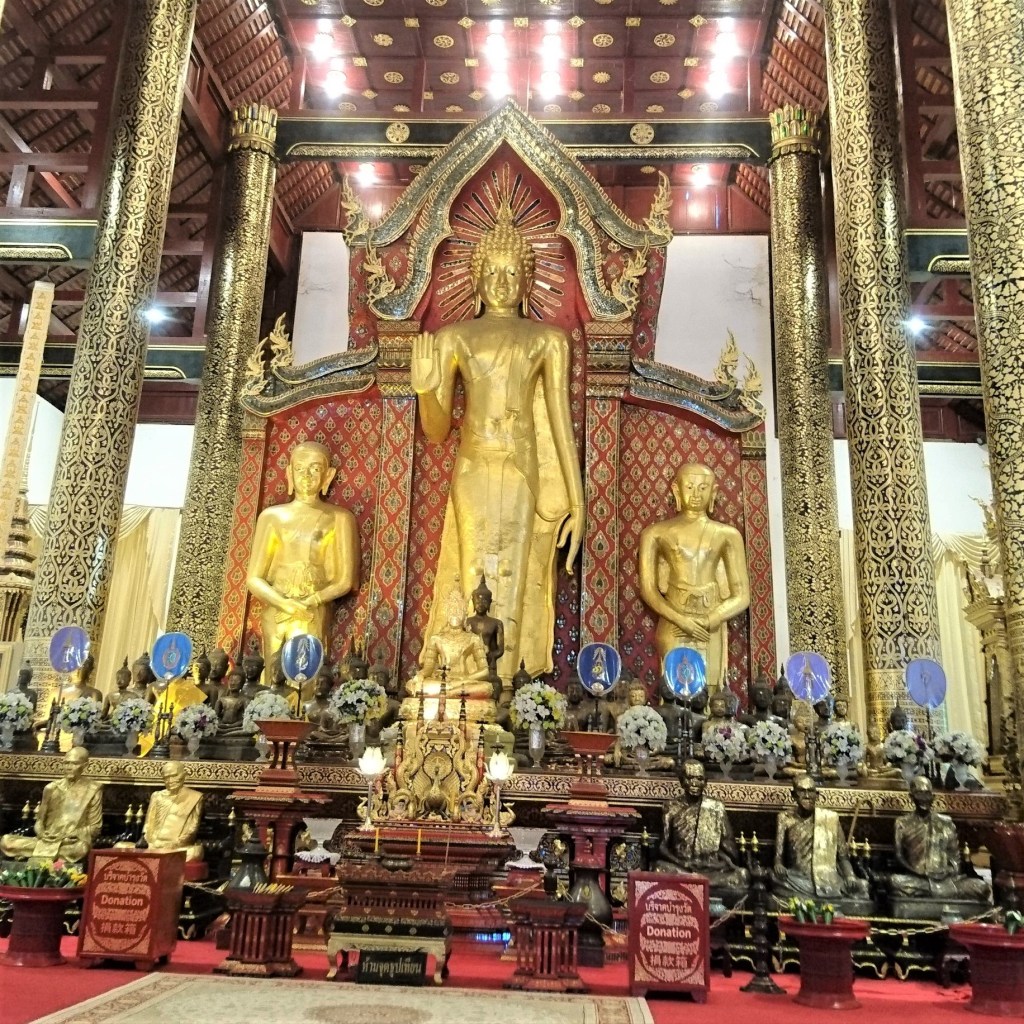 本堂の奥にあるご本尊。ランナー王朝の都が置かれたチェンマイは、「ランナー文化」と呼ばれるタイ北部独自の文化・伝統を生み出したが、この仏像にもランナー様式を見ることができる。ランナー様式の仏像は、丸みを帯びた柔和なお顔が特徴である。