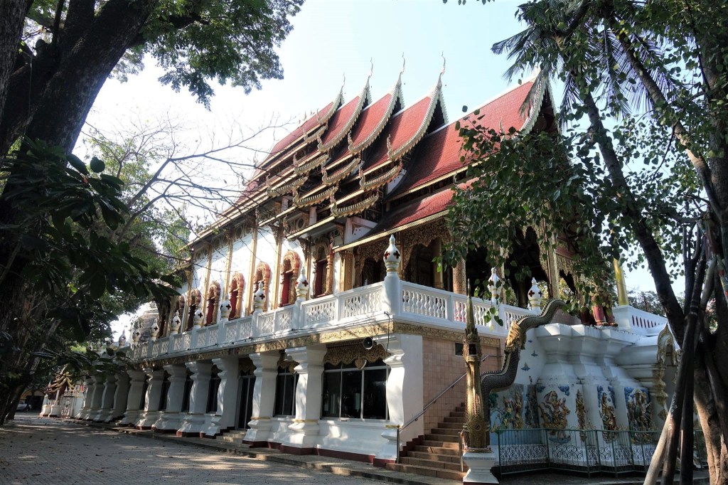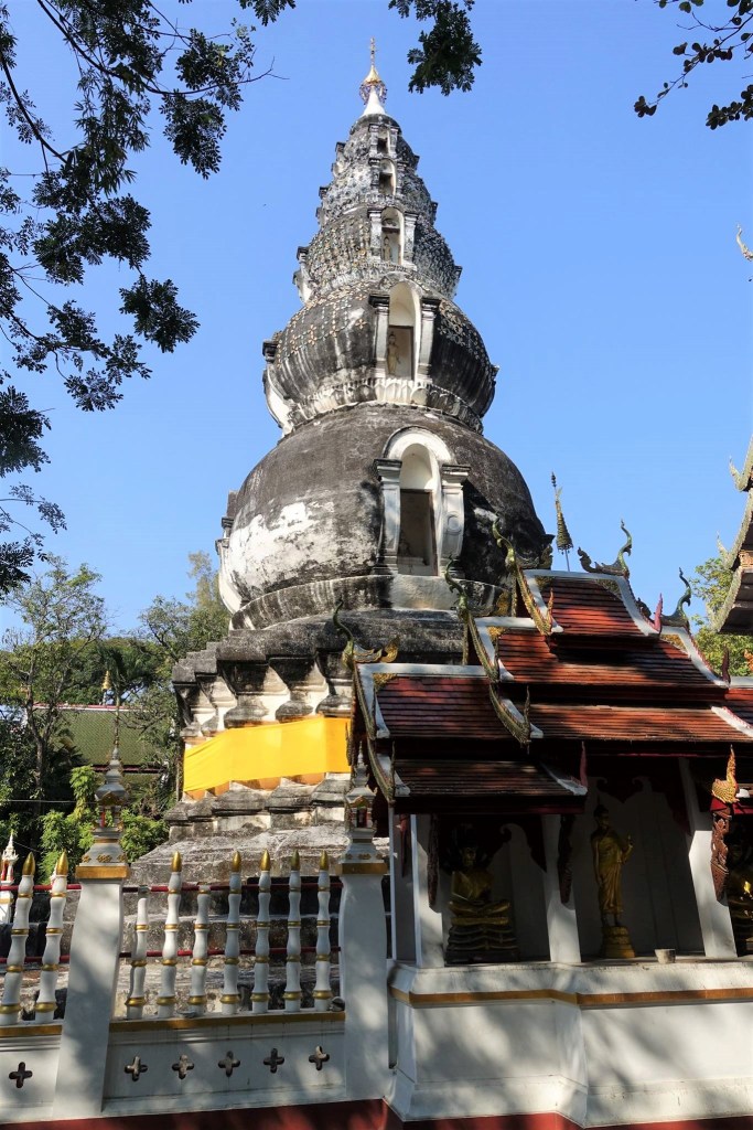 チェンマイ旧市街の北に位置するユニークな仏教寺院で、1579年~1607年にチェンマイを統治していたビルマ王プレーンノーンの墓として1613年に建立されたといわれている。お椀を重ねたような独特なひょうたん型をしたビルマ様式。これは仏陀が最初に教化したとされる「5人の修行僧の托鉢の鉢」を表しているという。