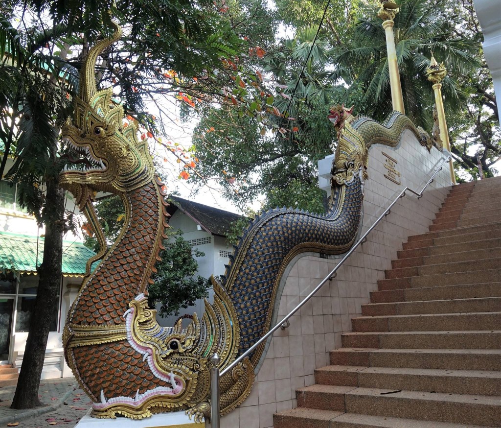 本堂へ続く階段には、インド神話に起源をもつ蛇の精霊ナーガが出迎える