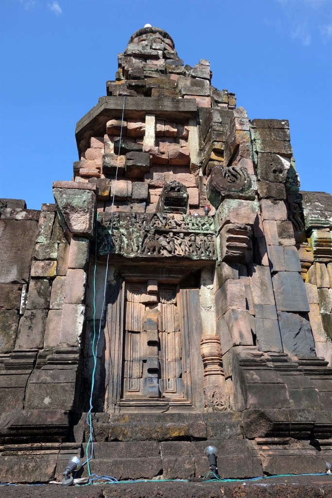 この遺跡は11世紀から12世紀の間に建てられたクメール遺跡で、仏舎利の表面にはクリシュナ神がシンハーの後ろ足をつかんで戦っている様子のレリーフが残っている