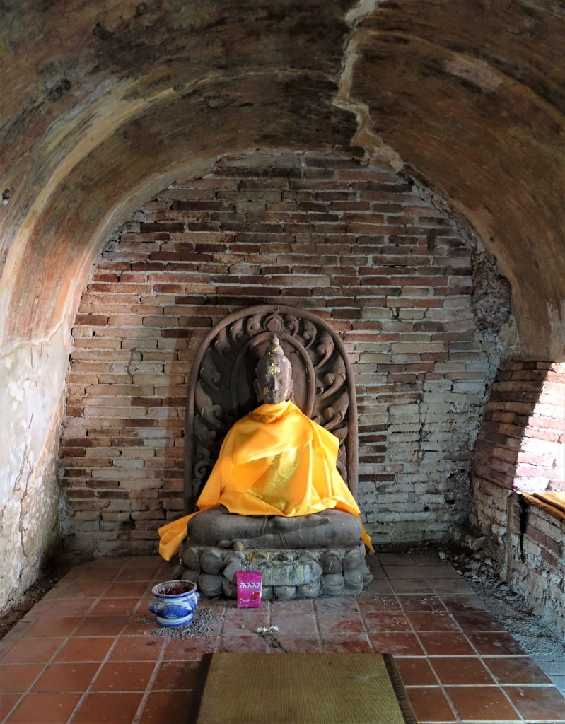 トンネル内を裸足で進んでいくと、ひんやりと感じる石タイルの床、ここで瞑想。空気はとても冷ややか。お参りするタイ人たち