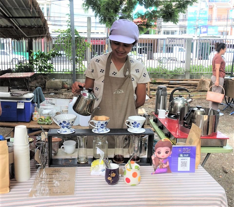 チェンマイ大学農学部キャンパス内に市が立つのに合わせ、こんな素敵な「野点コーヒー屋さん」が来る。チェンマイの街中にはエアコンの入ったカフェが乱立する昨今、なんかホッとする。ドリップで丁寧に淹れてくれる。コーヒー豆を手動のミルで挽く音は、ここでしか聞けない。