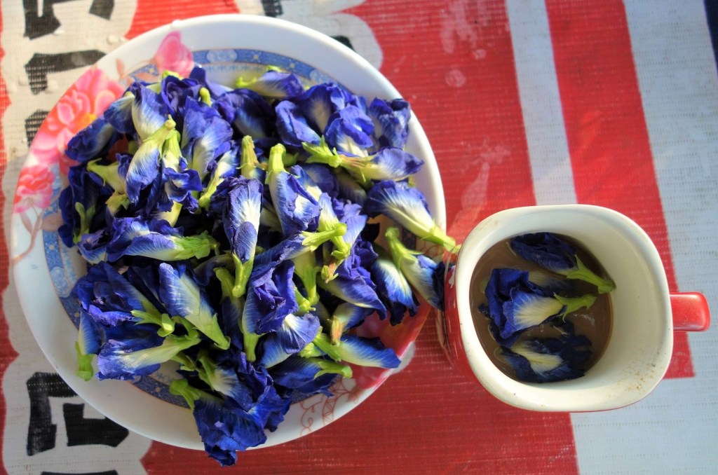 アンチャン花の天ぷらや青いアンチャン花麺、アンチャン花のサラダ、アンチャン花を入れて炊いた青いご飯なども食べたことがある。アンチャン花の天ぷらは塩で食べるととても美味しい。チェンマイにはアンチャン花料理の専門店もある。