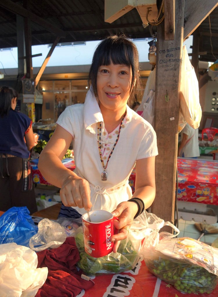 朝市で出会ったコーヒー屋さん アンチャンの花を見てたら、コーヒーの中に花を3つ入れかき混ぜ、さらに3つのせて差し出してくれた。なんて優しいタイ人
