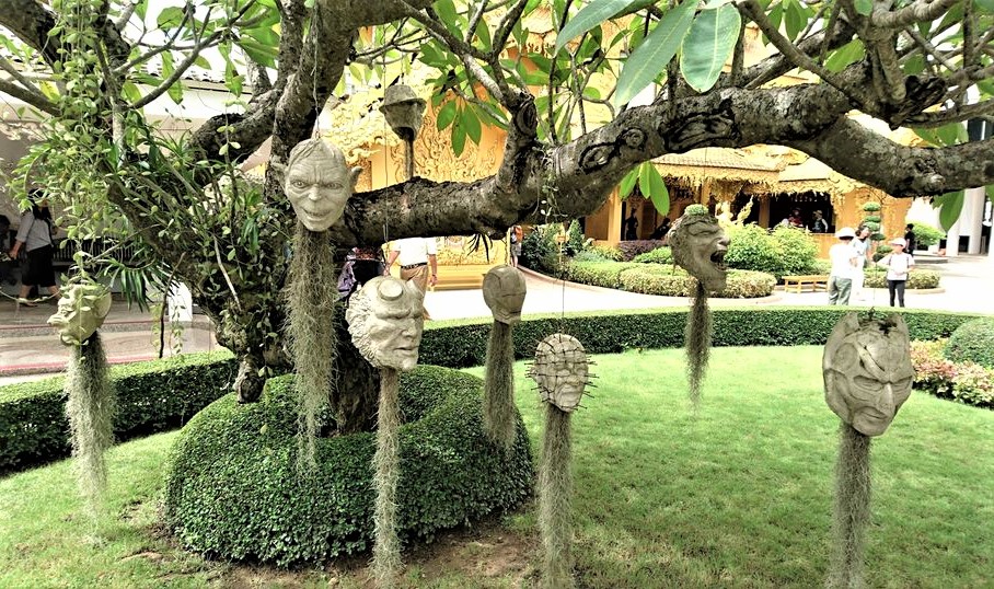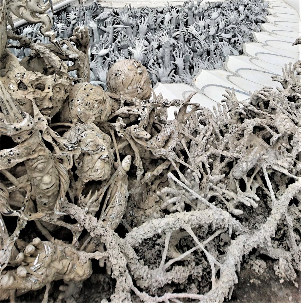 ワットロンクンの本堂に行くには、寺院正面に「輪廻転生の橋」と「血の池」地獄がある。池の中からは、救いを求めて虚空をつかむ無数に伸びる手が… これは成仏できずに、さまよい続ける魂。金銭欲や物欲や色欲に憑りつかれ、地獄に落ちた人々の苦しみ、うめき声である。
