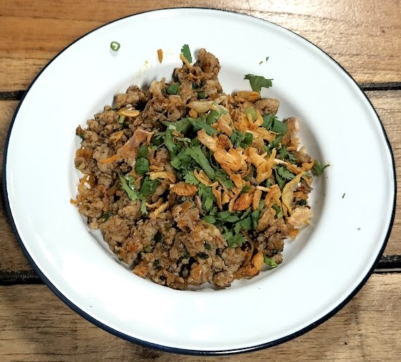 チェンマイの北タイ料理屋フアンムアンチャイのラーププラー。キャベツといっしょに食べる