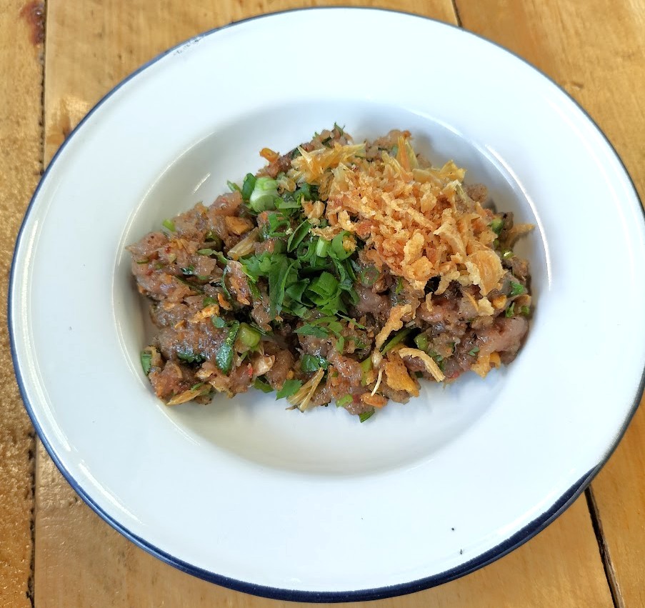 きょう近くの北タイ料理店で「焼米入りプラーニンとナマズのラープ」を食した チェンマイ 89B 思ったより辛かった