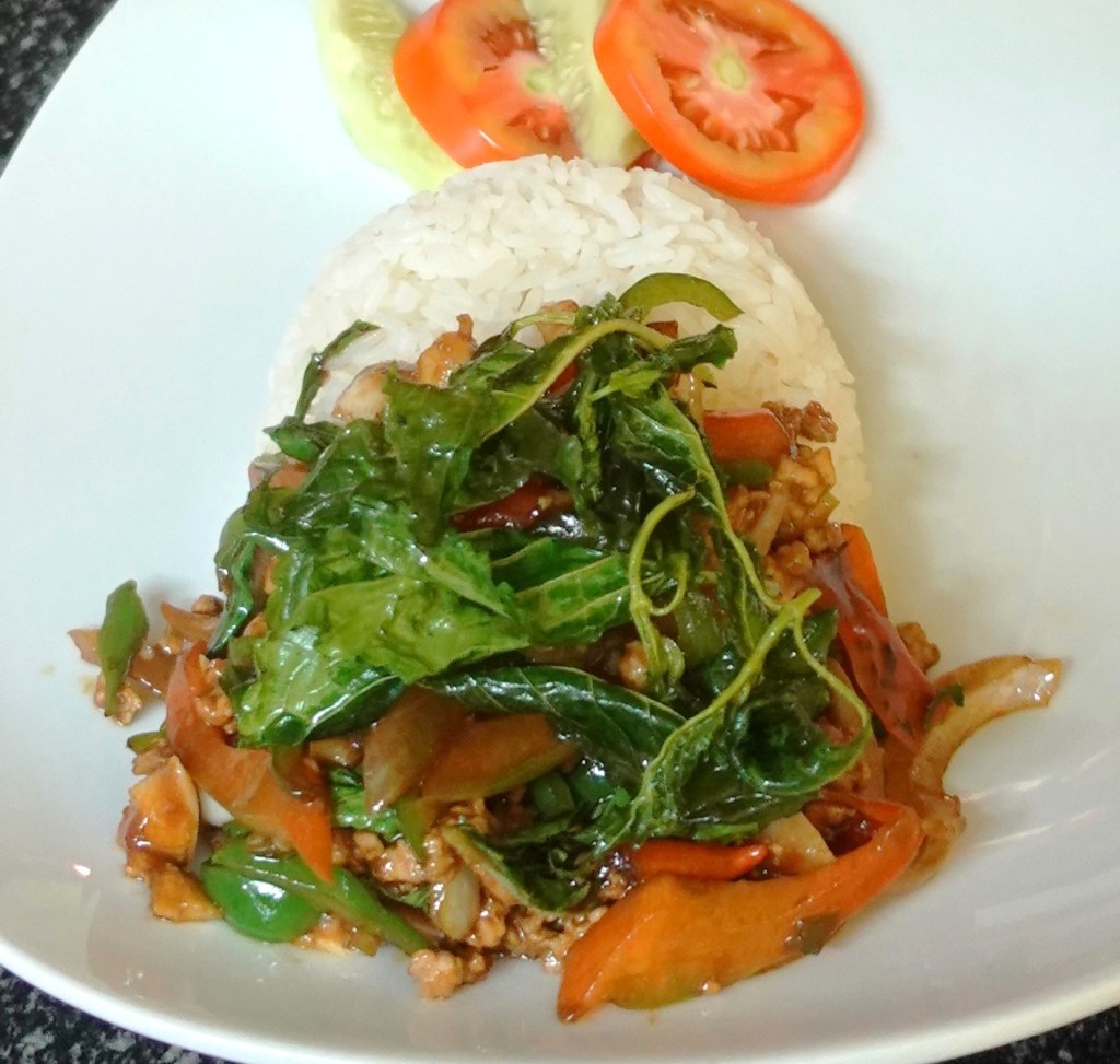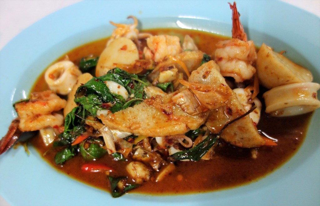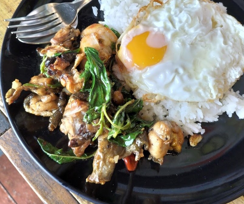 南タイで食べた海鮮ガパオ、カニや貝が入っている、鶏肉も