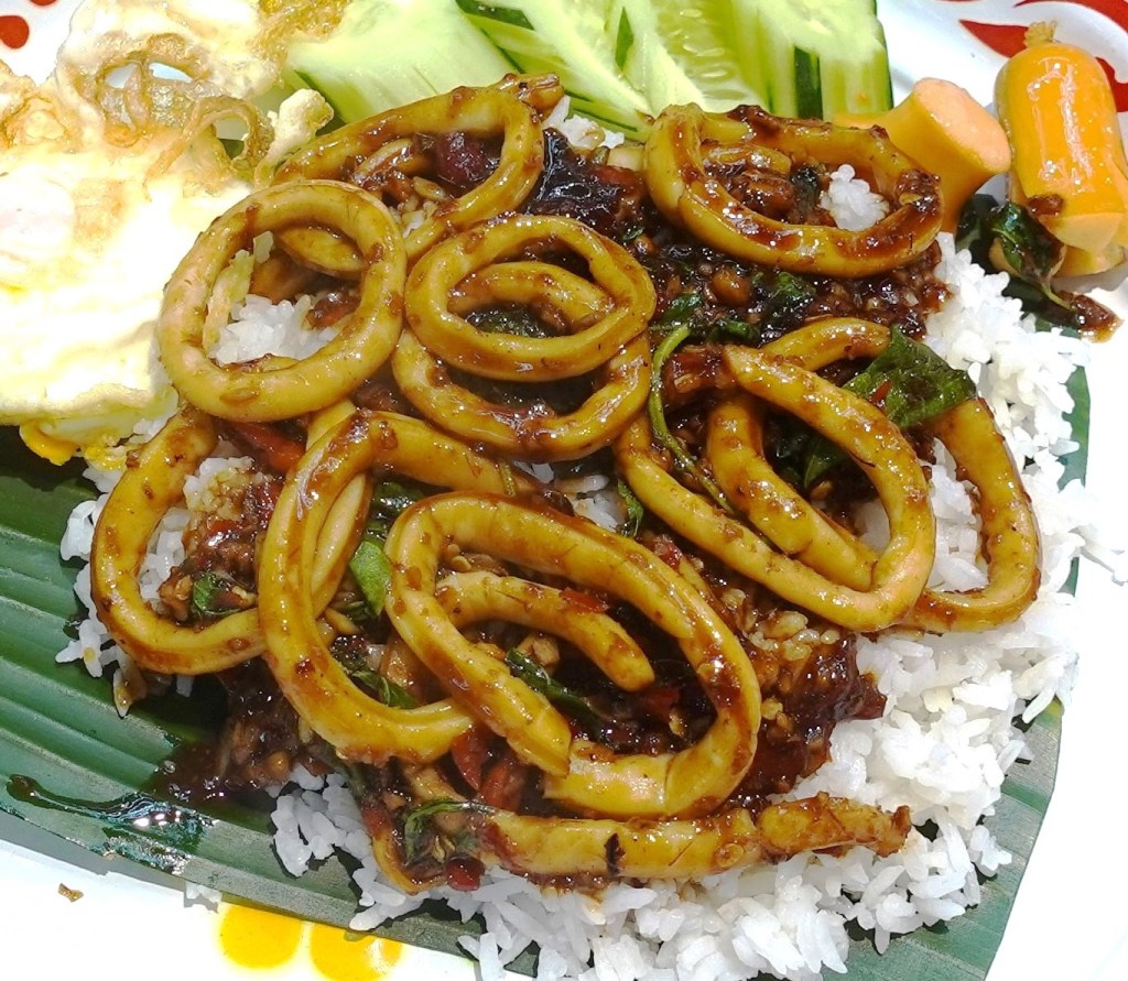 タイ東北部ナコーンパノムの海鮮ガパオ炒め