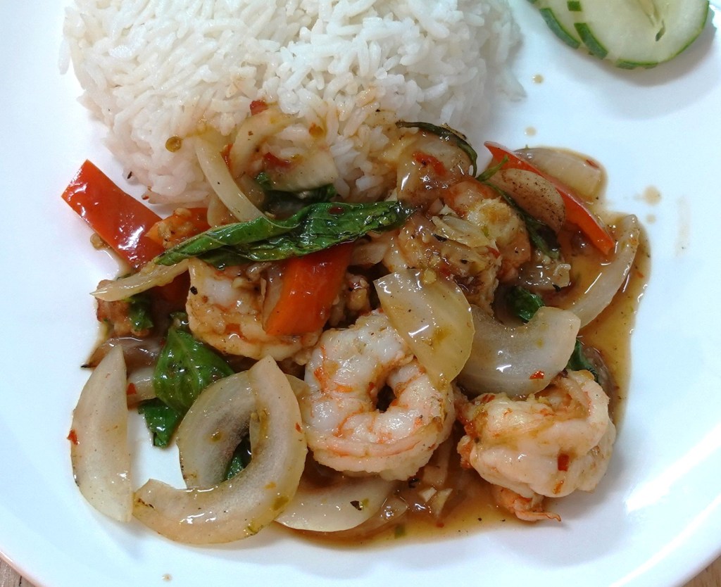 チェンマイのサンティタムの食堂で「エビとイカのガパオ・ライス」70B
