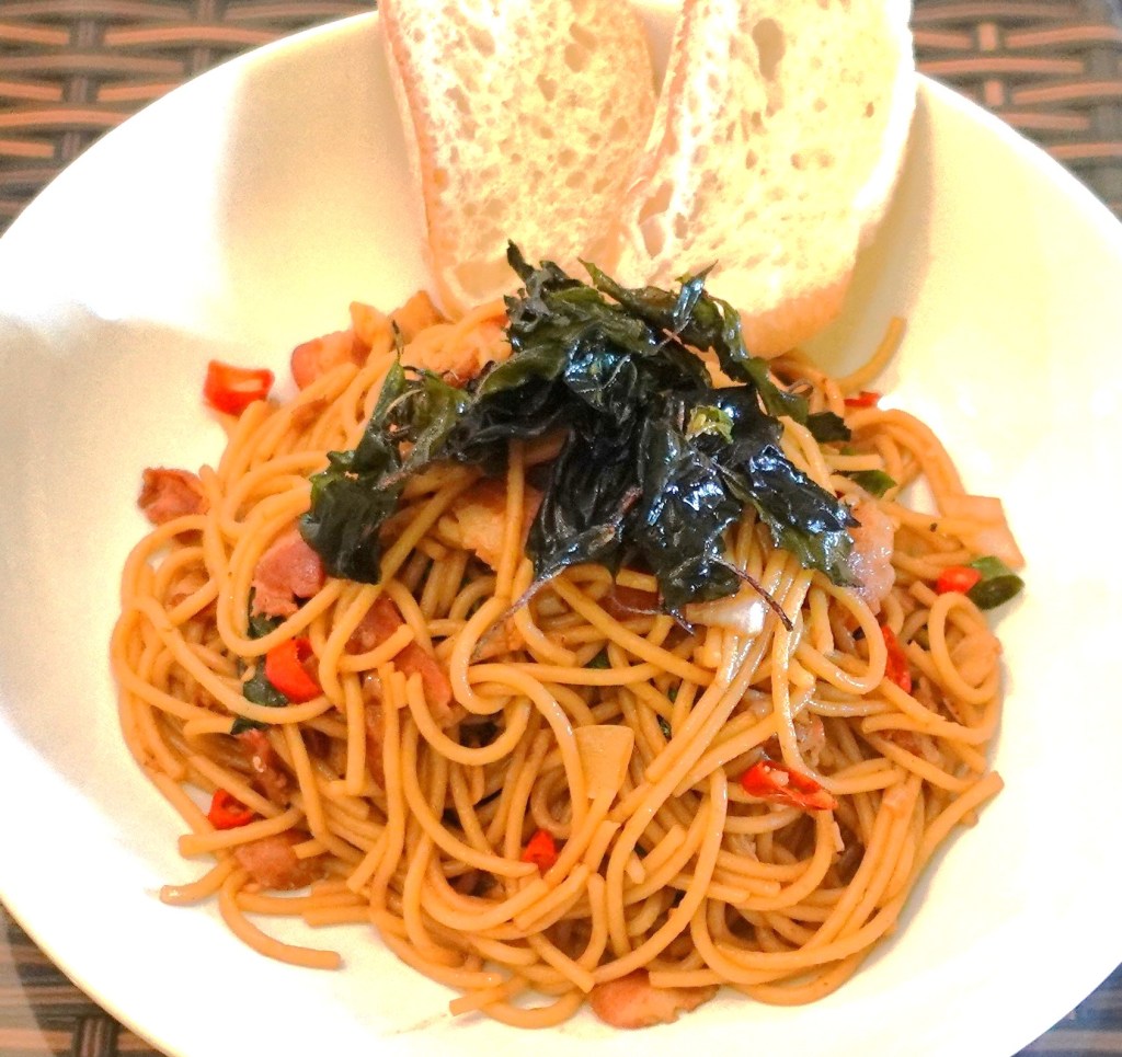 焼きサーモンとガパオのせ黒スパゲティ 西洋人も食べやすいようにスイートバジル