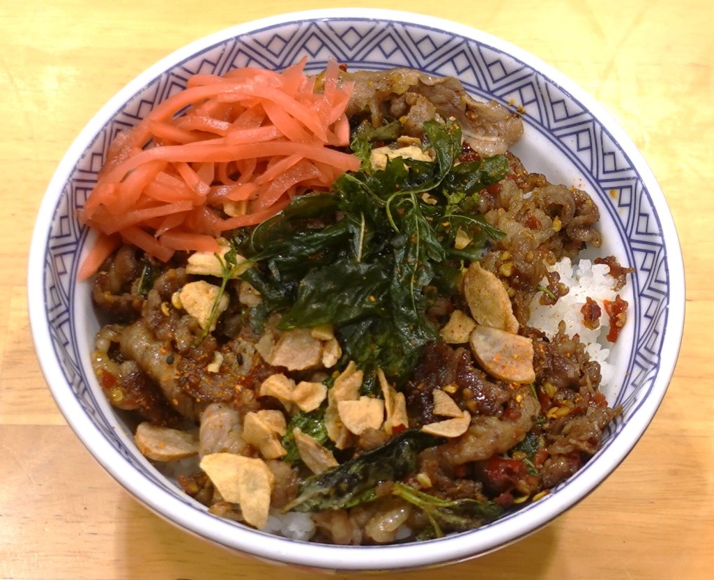 チェンマイのセントラル・フェスティバル5階の吉野家に、素揚げの「ガパオ葉」をトッピングした牛丼がある。ガパオ葉は大好きだけど、牛丼には合わないような気がした。169B