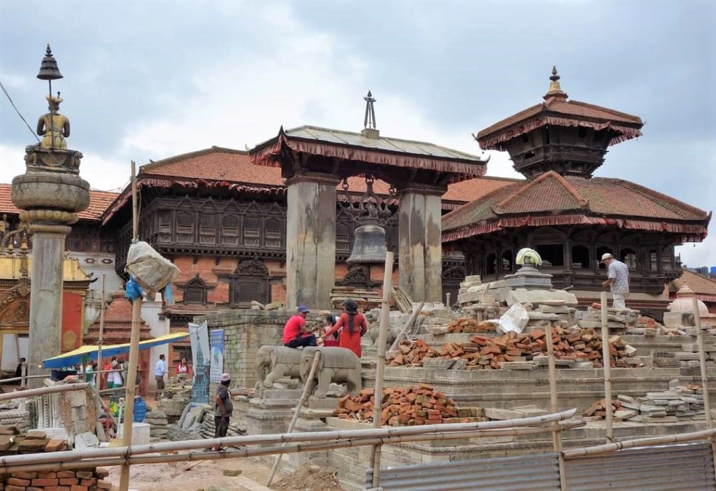 石段を登りきり広場を振り向くと、左手に「バイラヴナート寺院」がある。そしていたるところで、2015年4月に発生したネパール地震で被災した建物の復旧作業が続いているのが目に入った。