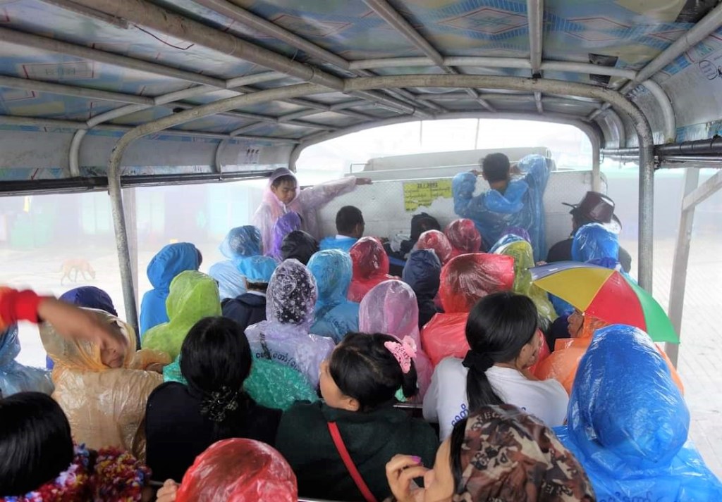 山のふもとの街から、政府が運営するトラックの荷台に設けられた座席に乗って、頂上に向かう。満席になり次第出発し、所要時間は約1時間。かなりけわしい坂道を登って行く。この日はあいにく小雨が降っていた