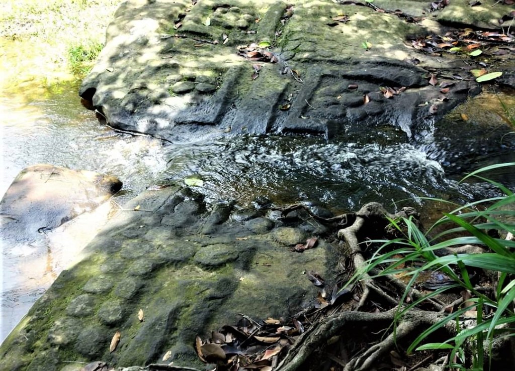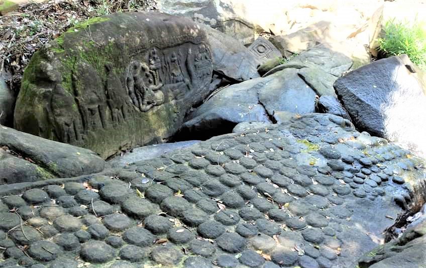 水中遺跡「クバールスピアン」乾季は川の水が干上がり川底の彫刻が露出し、雨季には続く雨の増水で水中の彫刻が見えない。格子状に配されたヨニ