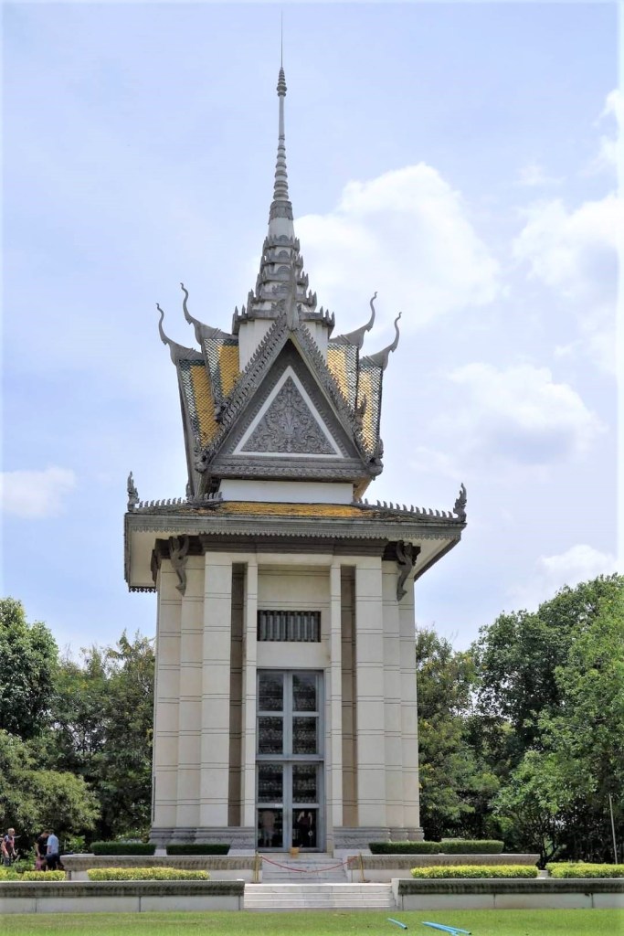 キリングフィールドの入口にそびえたつ「慰霊塔」