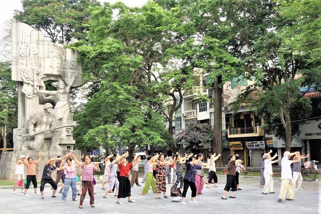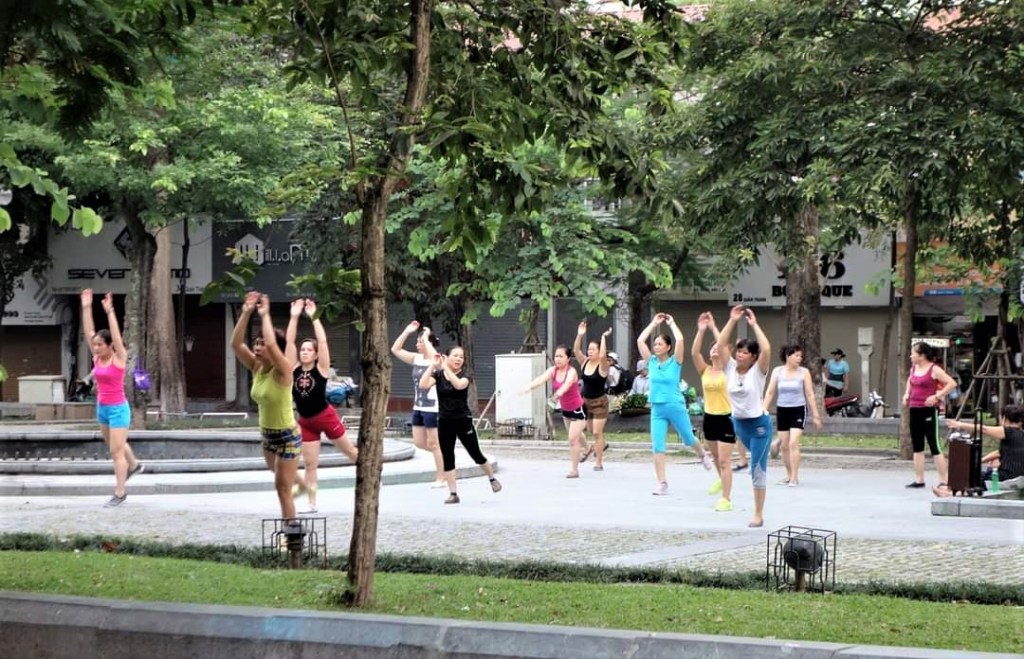 ハノイで宿泊したホテルの前は細長い公園になっていた。その公園で早朝から年配たちの太極拳や若い人たちの大音量でのエアロビクス、動きが入った瞑想、太鼓の練習、真剣勝負のバドミントン、ジョギング、ウオーキン、ウエイトトレーニングなど思い思いのことをやっていた。